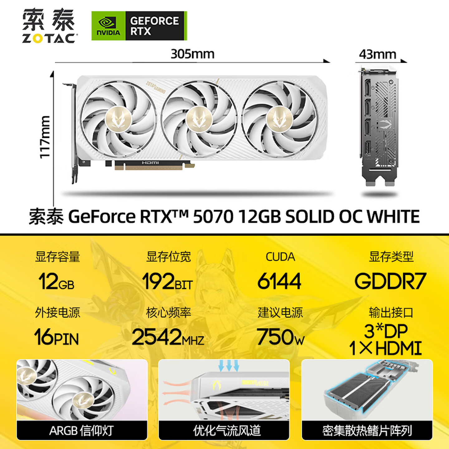 索泰显卡 RTX 5070 12G SOLID OC 白 三风扇/HDMI+DP (22802)
