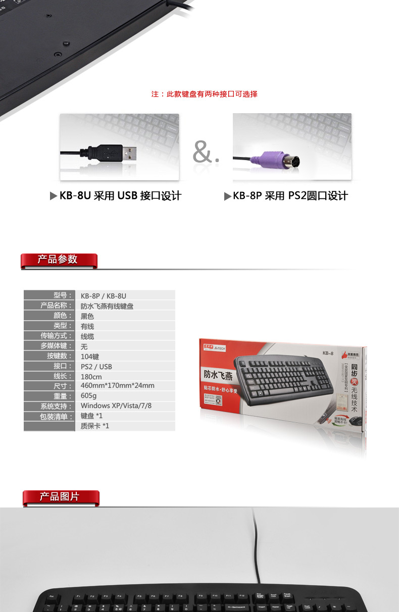 商品名称:双飞燕 KB-8U 防水有线键盘 USB口(9048)