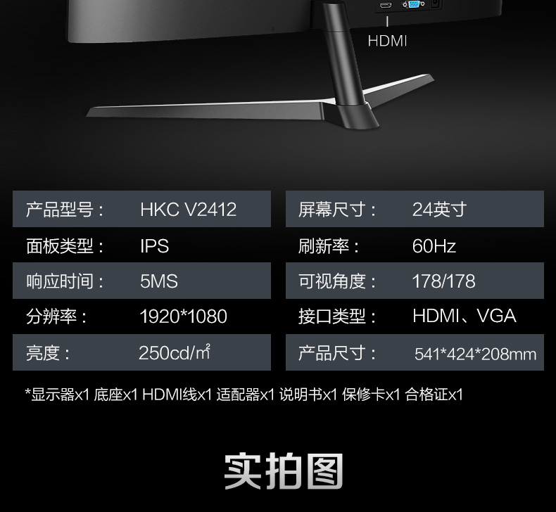 商品名称:HKC显示器 V2412 直面 24寸IPS VGA+HDMI (13300)