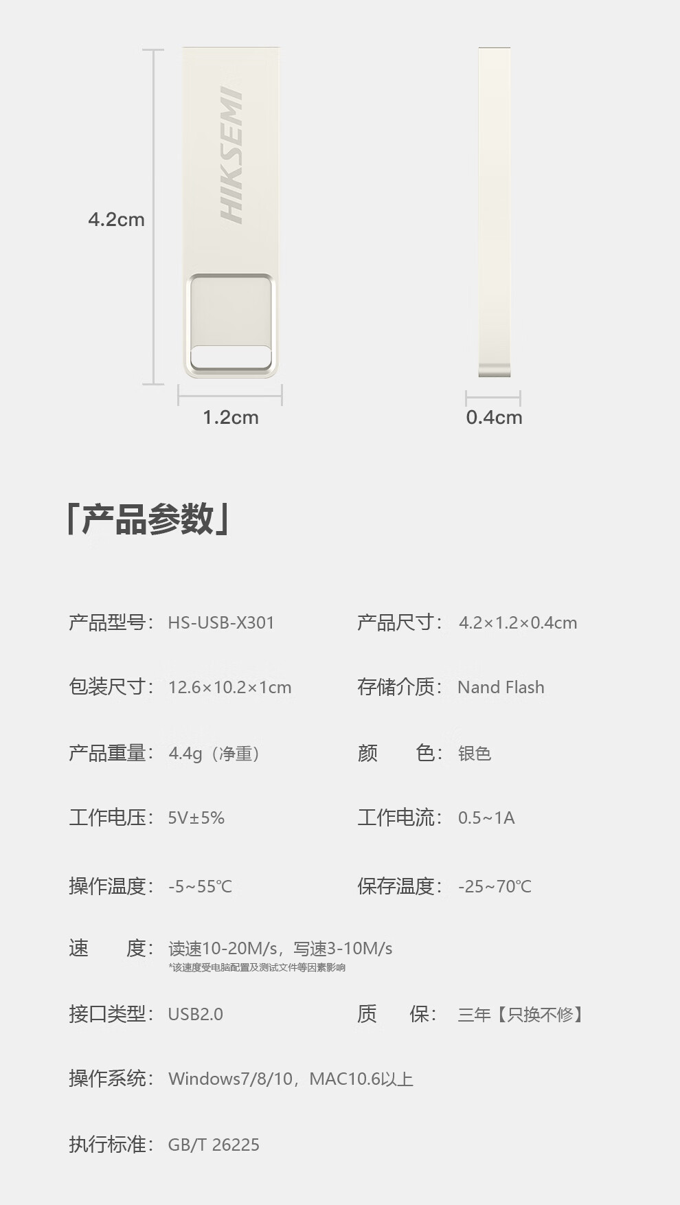 商品名称:海康威视 X301 32GB USB2.0 U盘 金属外壳 商务便携 银色(13679)