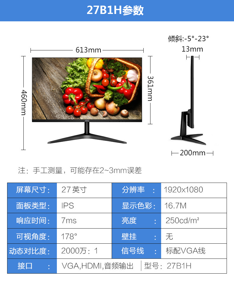 商品名称:AOC显示器 27B1H/WW 27寸 白色 (12039)
