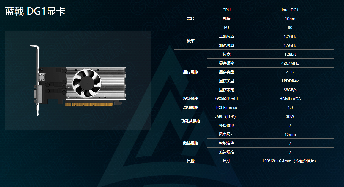 商品名称:Intel显卡 锐矩 DG1 4G 单风扇 VGA+HDMI 工包 (14432)