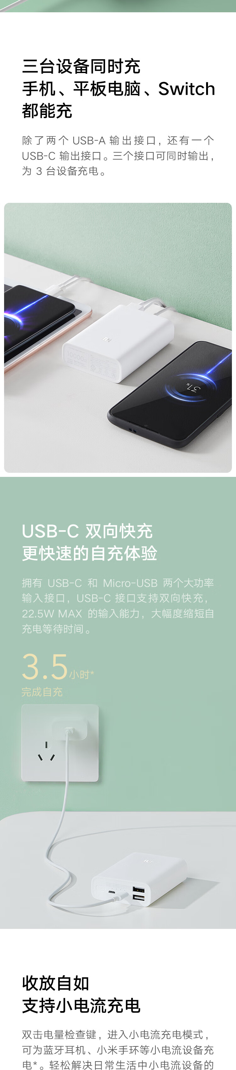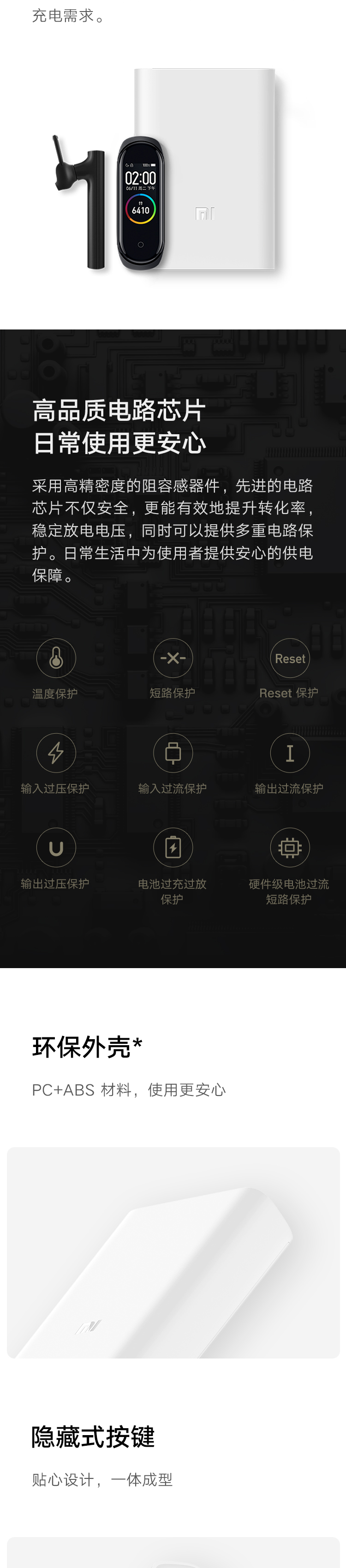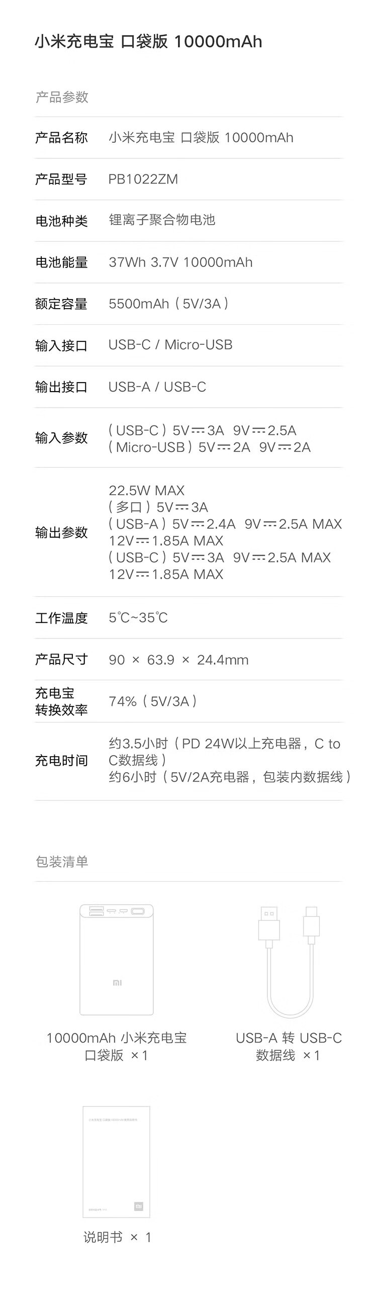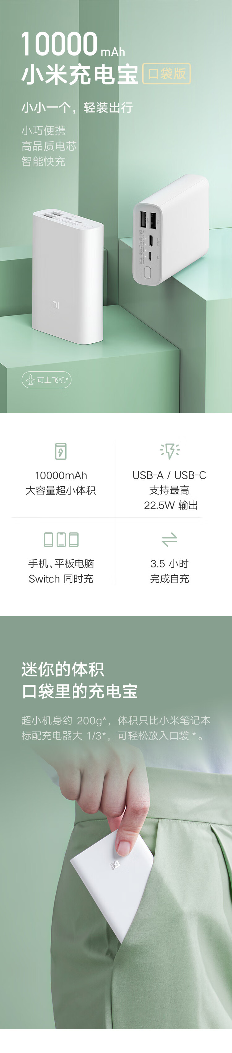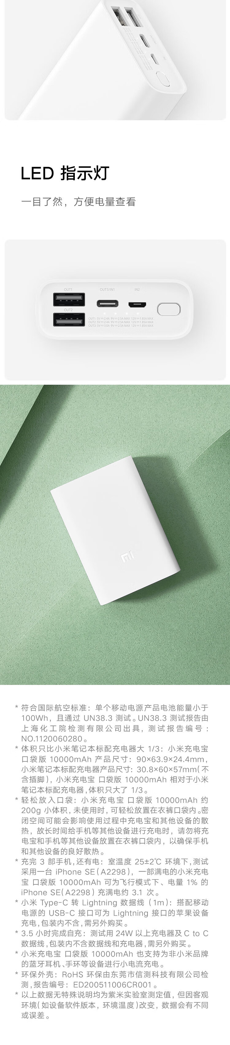 商品名称:小米 充电宝 移动电源3 10000毫安 双向快充 口袋版 白色 (14823)