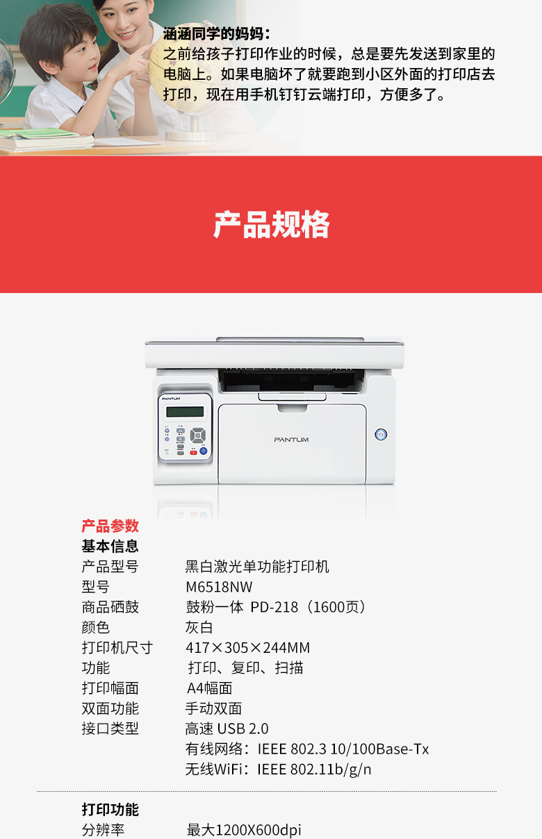 商品名称:【奔图】 黑白激光打印一体机 M6518NW 打印/扫描/复印/支持钉钉云打印 南京仓发货 (15091)