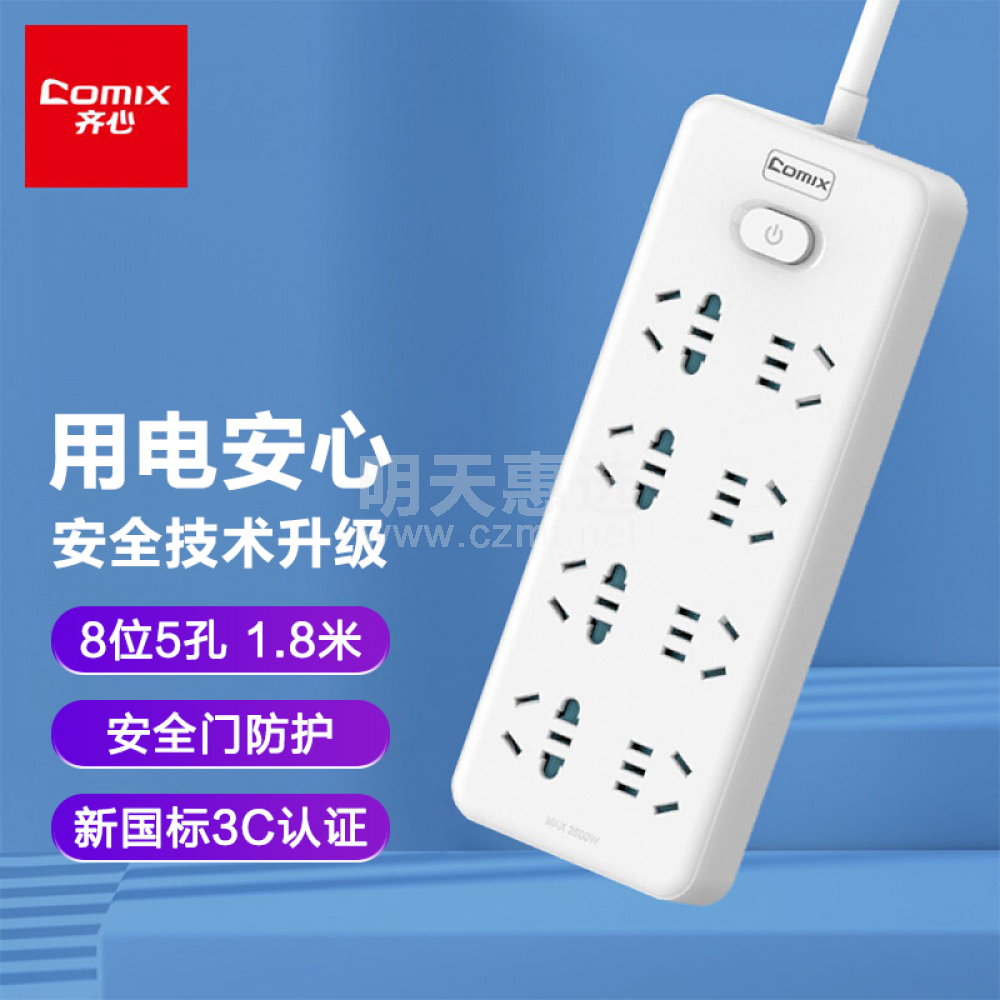 齐心 新国标 插座/插线板/接线板 LCE-4018 8位5孔 1.8米 白色/总控 买10个送1个(15263)