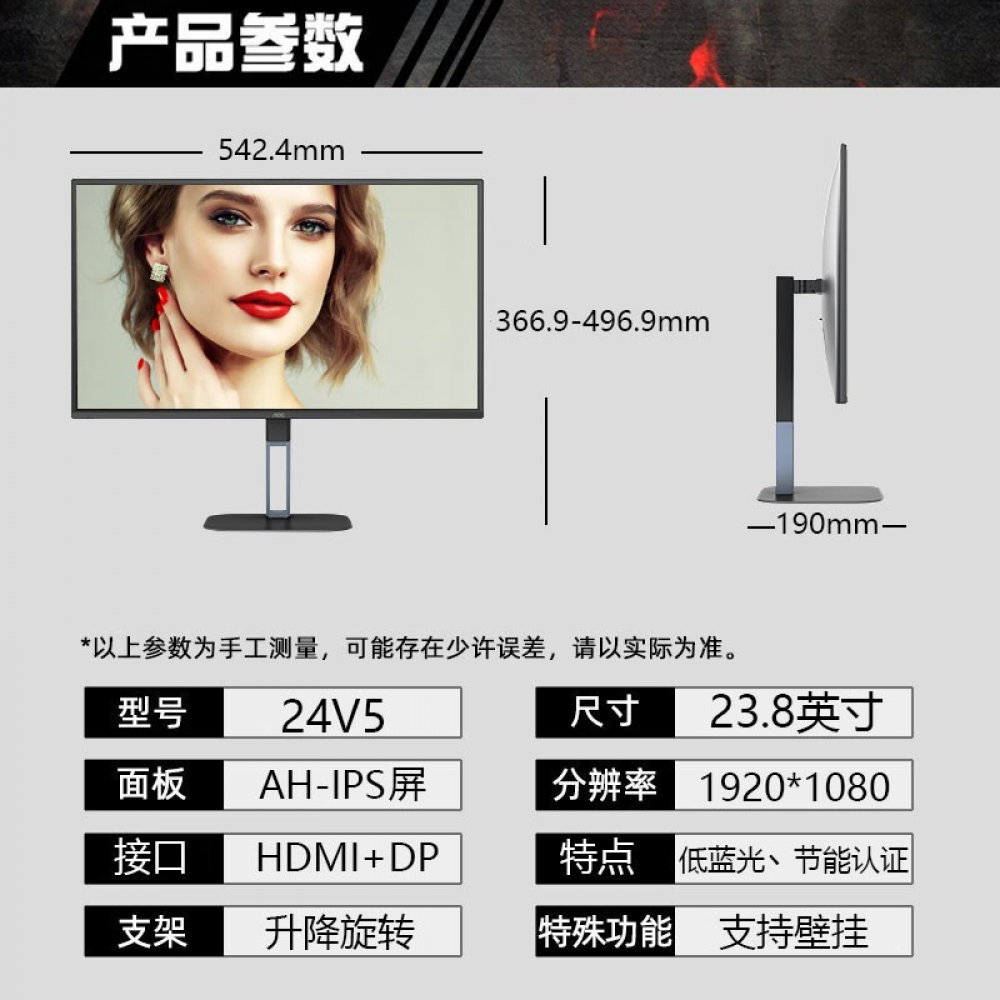 商品名称:AOC显示器 24V5 24寸 IPS屏 升降旋转 HDMI+DP (15227)