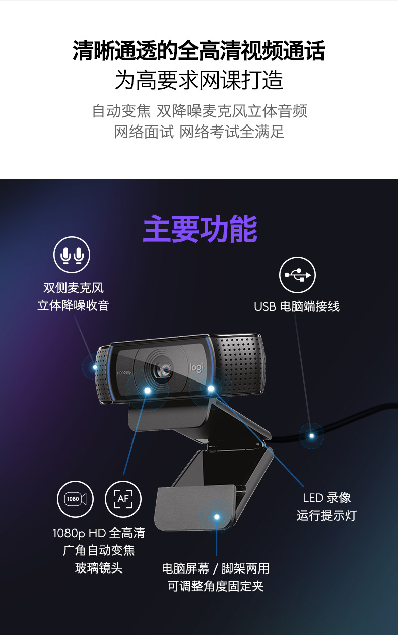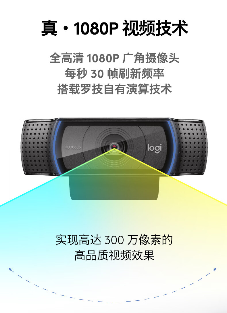 罗技 C920 PRO 直播摄像头 1080P高清 30fps 双麦拾音 (16108)