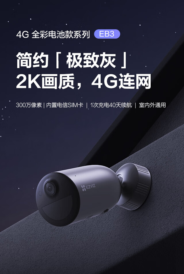 商品名称:海康 萤石 300万 EB3 4G全彩 无线监控摄像头 2K画质 电池相机 (16456)