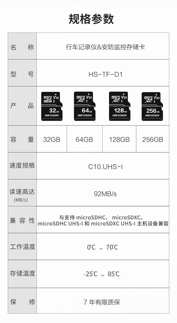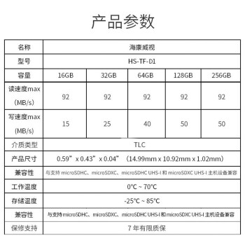 商品名称:海康威视 D1 TF卡 32G 92M/S 行车记录仪平板 智能安防监控摄像头存储卡(16616)