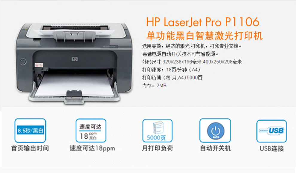 商品名称:HP惠普 黑白激光打印机 LaserJet Pro P1106 南京仓发货(8190)