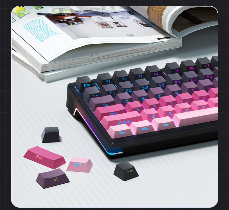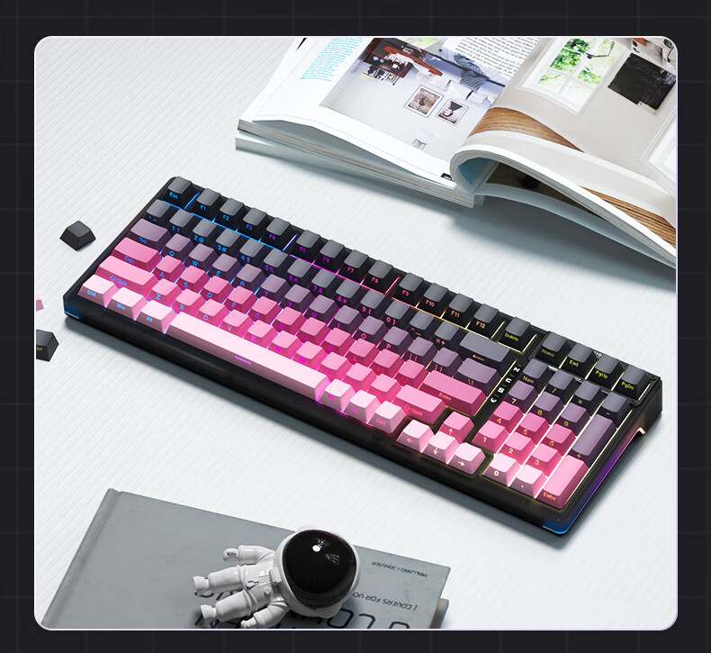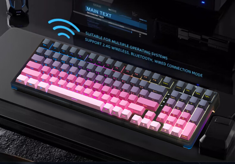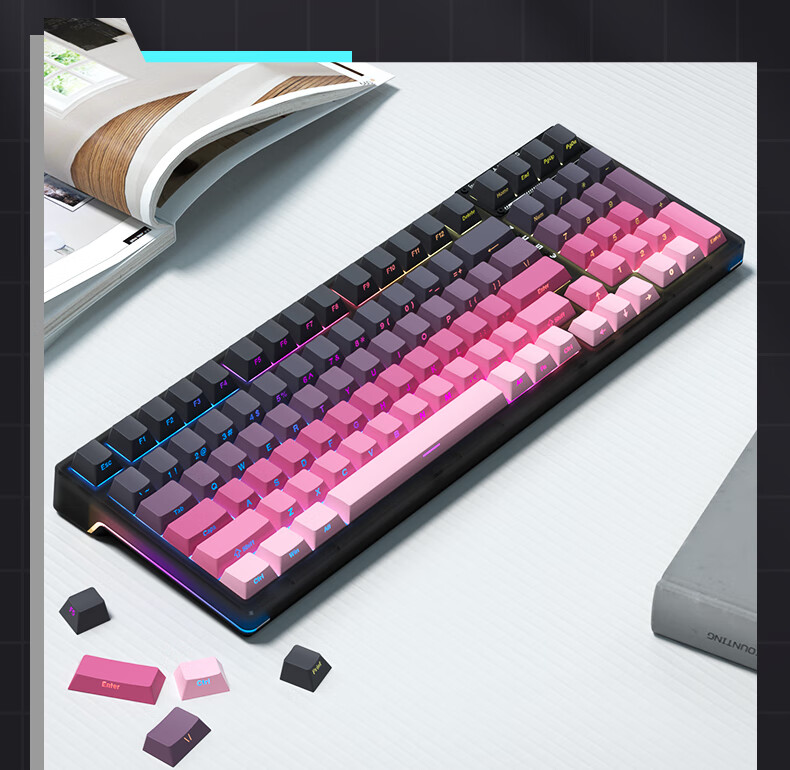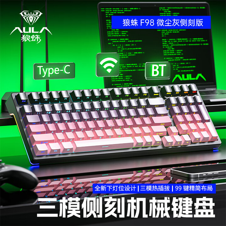 狼蛛 F98 黑透-听雨轴 黑莓粉侧刻版 机械单键盘 三模 无线+蓝牙 99键 (22044)
