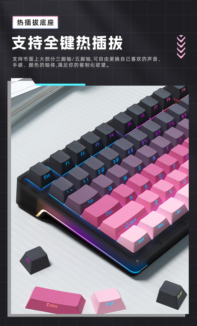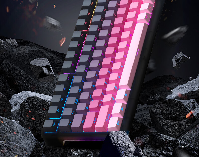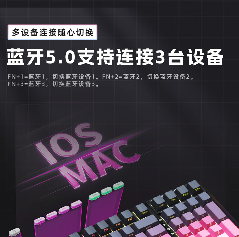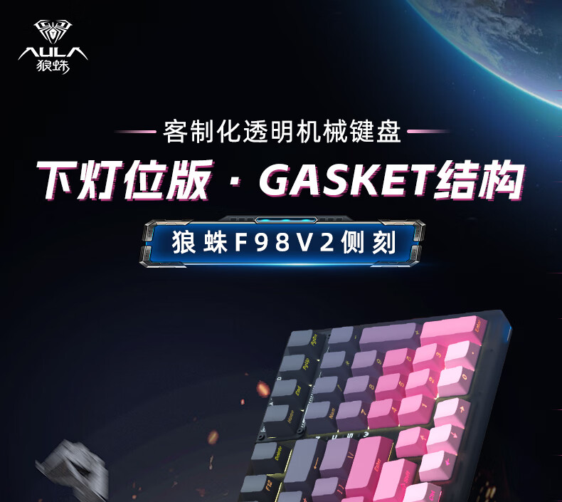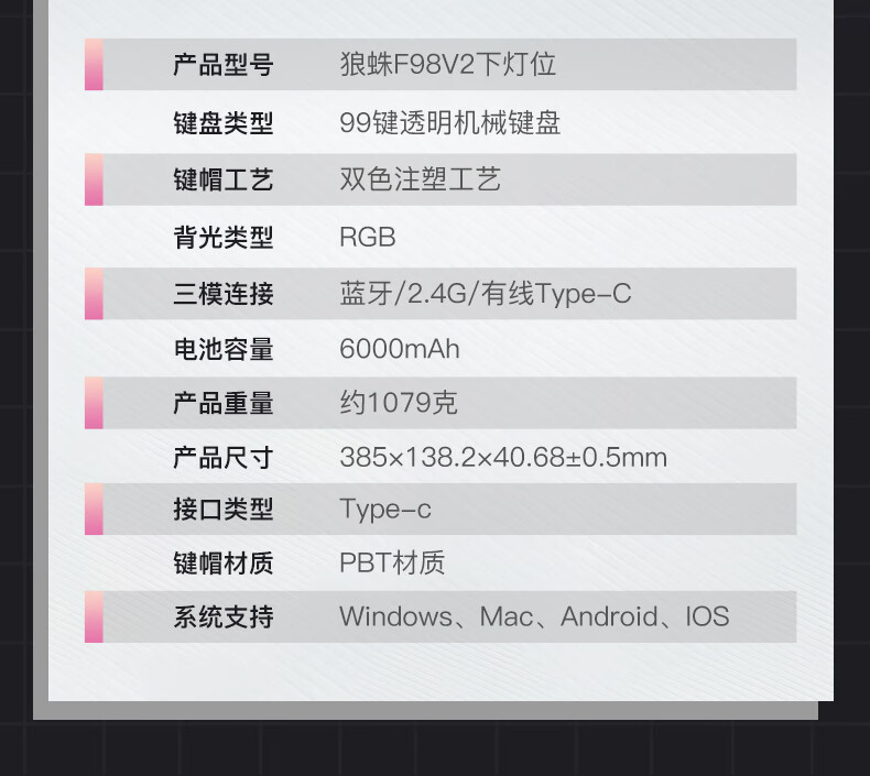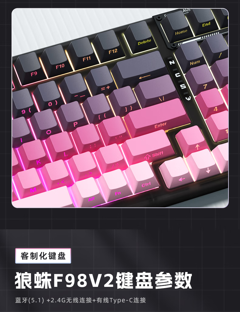 商品名称:狼蛛 F98 黑透-听雨轴 黑莓粉侧刻版 机械单键盘 三模 无线+蓝牙 99键 (22044)