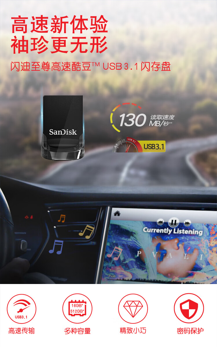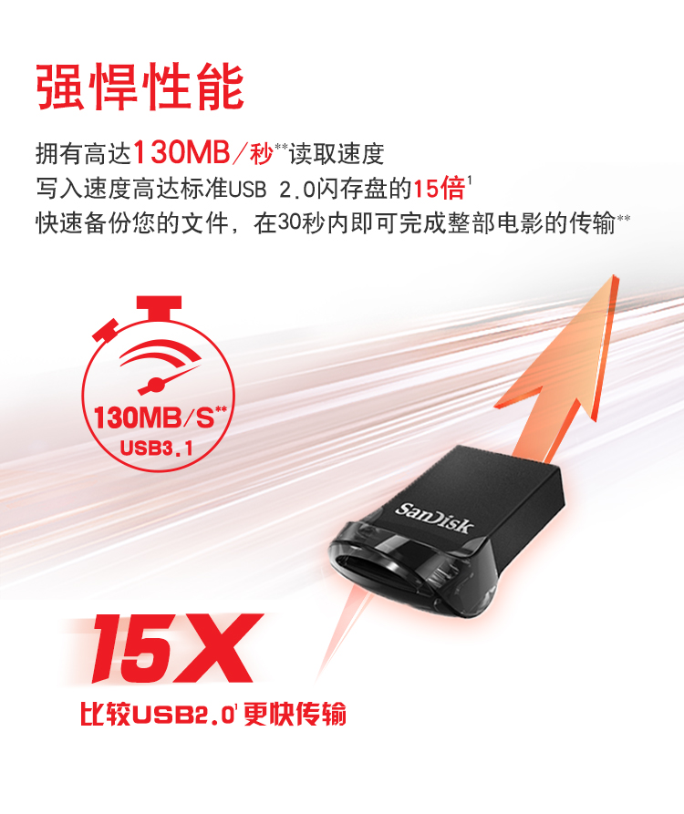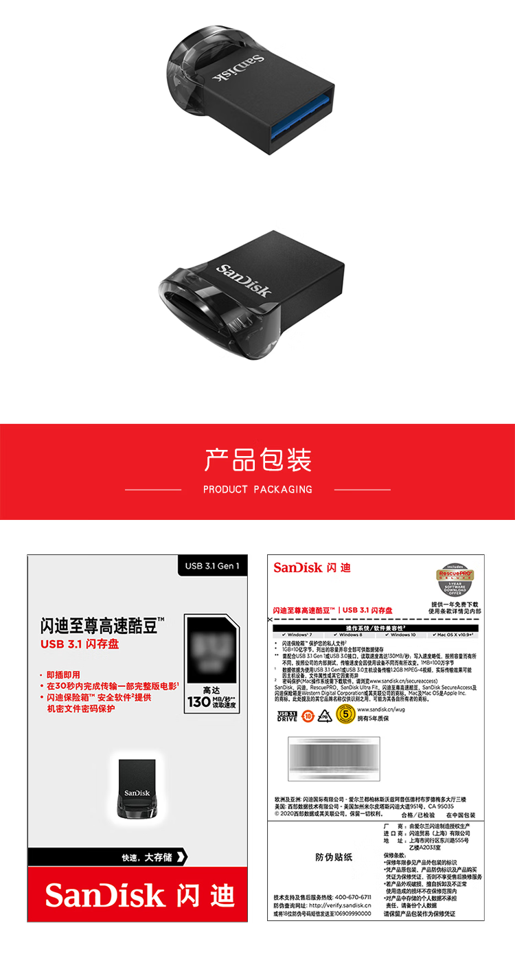 商品名称:闪迪 酷豆CZ430 64G USB3.1 U盘 黑色 读速130MB/s (18195)